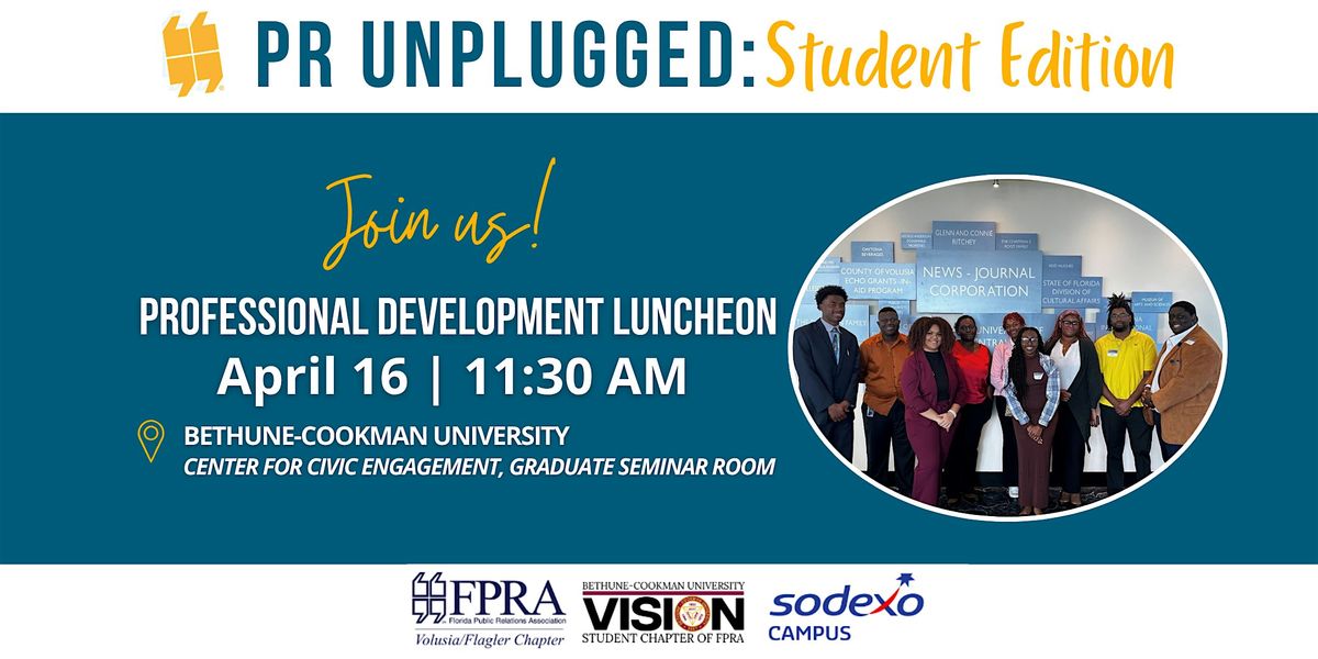 This year’s program is “PR Unplugged: Student Edition” – a partnership between FPRA Volusia/Flagler Chapter and B-CU's Vision Chapter for a student and professional collaborative meeting. This special program is sponsored by Sodexo Campus.
