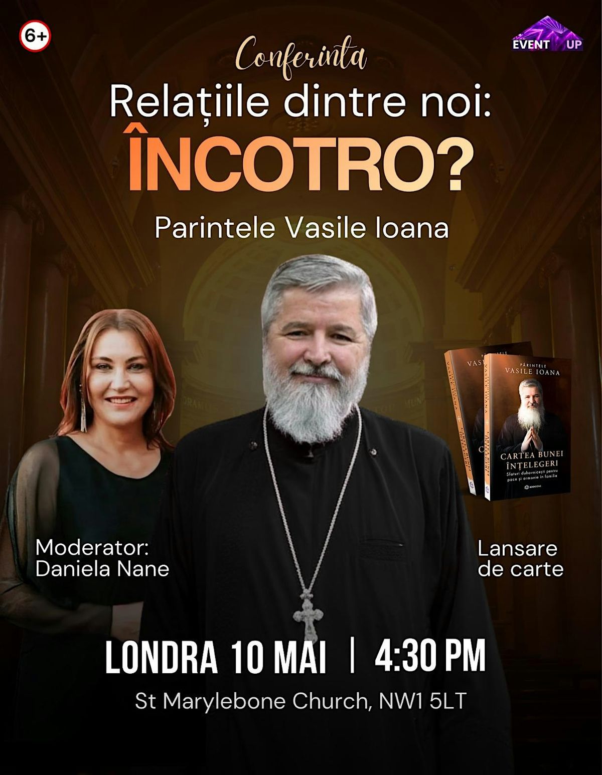 „Relațiile dintre noi: Încotro?” este o invitație la reflecție și transformare, într-un dialog autentic despre sensul și direcția relațiilor noastre — cu noi înșine, cu cei dragi și cu comunitatea din care facem parte.Pornind de la nevoia profundă de liniște interioară, conferința susținută de Părintele Vasile Ioana, si moderată de actrița Daniela Nane, ne ghidează spre înțelegerea modului în care această pace se poate reflecta în felul în care comunicăm, iertăm și construim relatii sănătoase.Într-o lume în care distanțele și ritmul vieții pot afecta conexiunile, întâlnirea de la Londra devine un spațiu de reconectare, claritate și inspirație pentru relații mai conștiente și mai armonioase.Conferința se încheie cu lansarea cărții „Cartea Bunei Înțelegeri” și sesiune de semnare a volumelor.