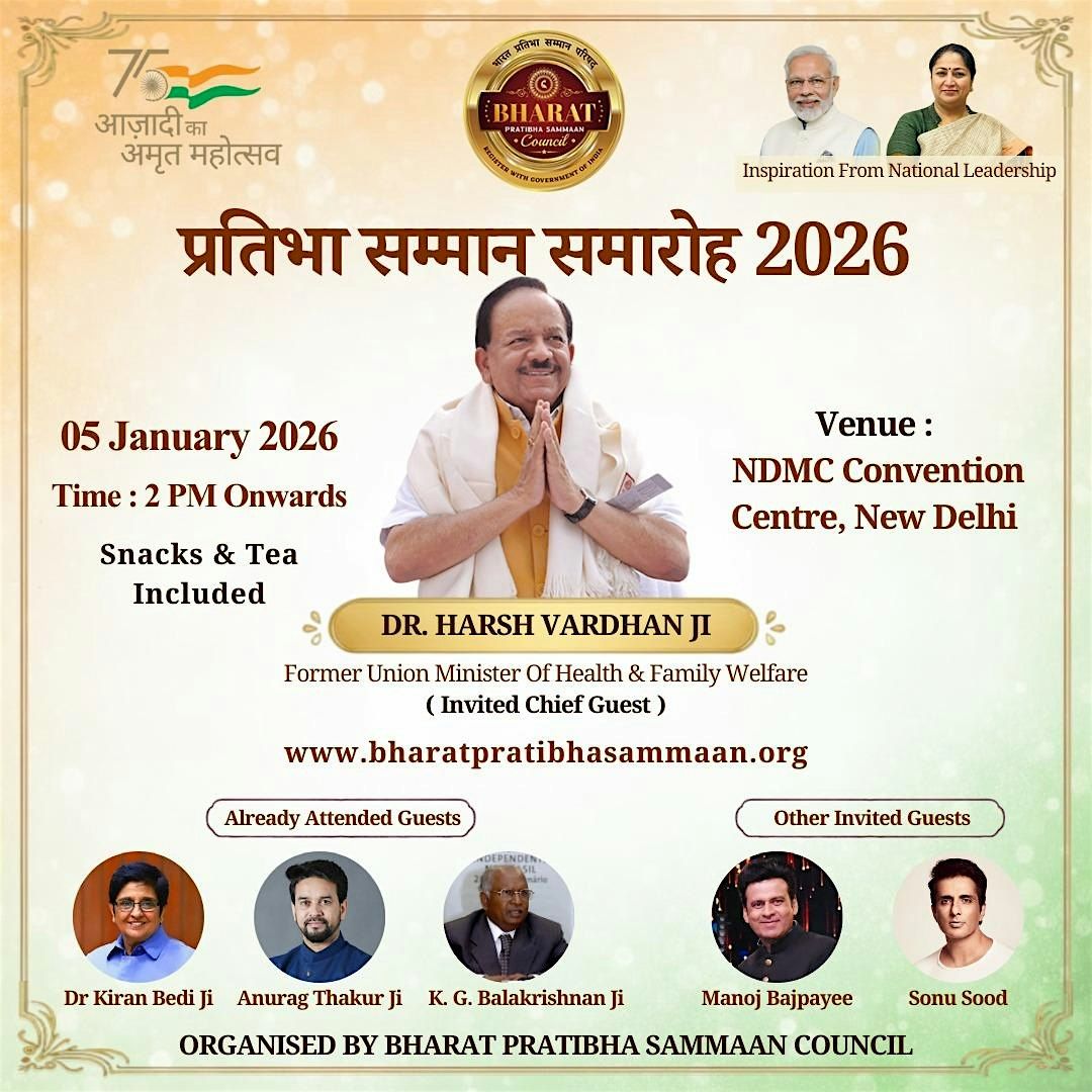 Pratibha Samman Samaroh 2026 is a prestigious national-level award ceremony organized by Bharat Pratibha Sammaan Council, dedicated to recognizing and honouring outstanding individuals who have made remarkable contributions to society, culture, governance, and nation-building.