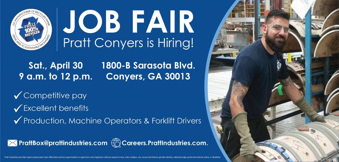 Take the next step in your career by attending our job fair Saturday April 30th from 9 a.m. to 12 p.m. at 1800-B Sarasota Business Parkway in Conyers. Pratt Industries is an equal opportunity employer. For more information email us at [email protected].