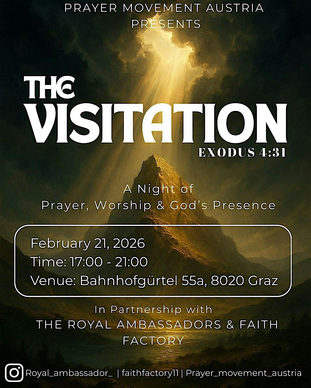 Get ready for an evening of prayer and worship at Bahnhofgürtel 55a. Let's come together on February 21, 2026 at 5:00 PM (Central European Time) to lift our voices and hearts in unity. This is not an Ordinary Meeting but a divine appointment with destiny.
