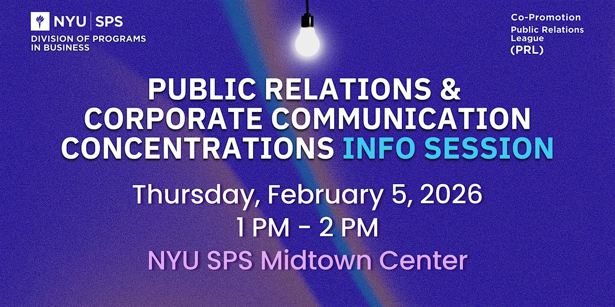 Join the for an in-person info session on Thursday, February 5, from 1–2 PM ET to explore the concentrations in the Public Relations & Corporate Communication (PRCC) program.