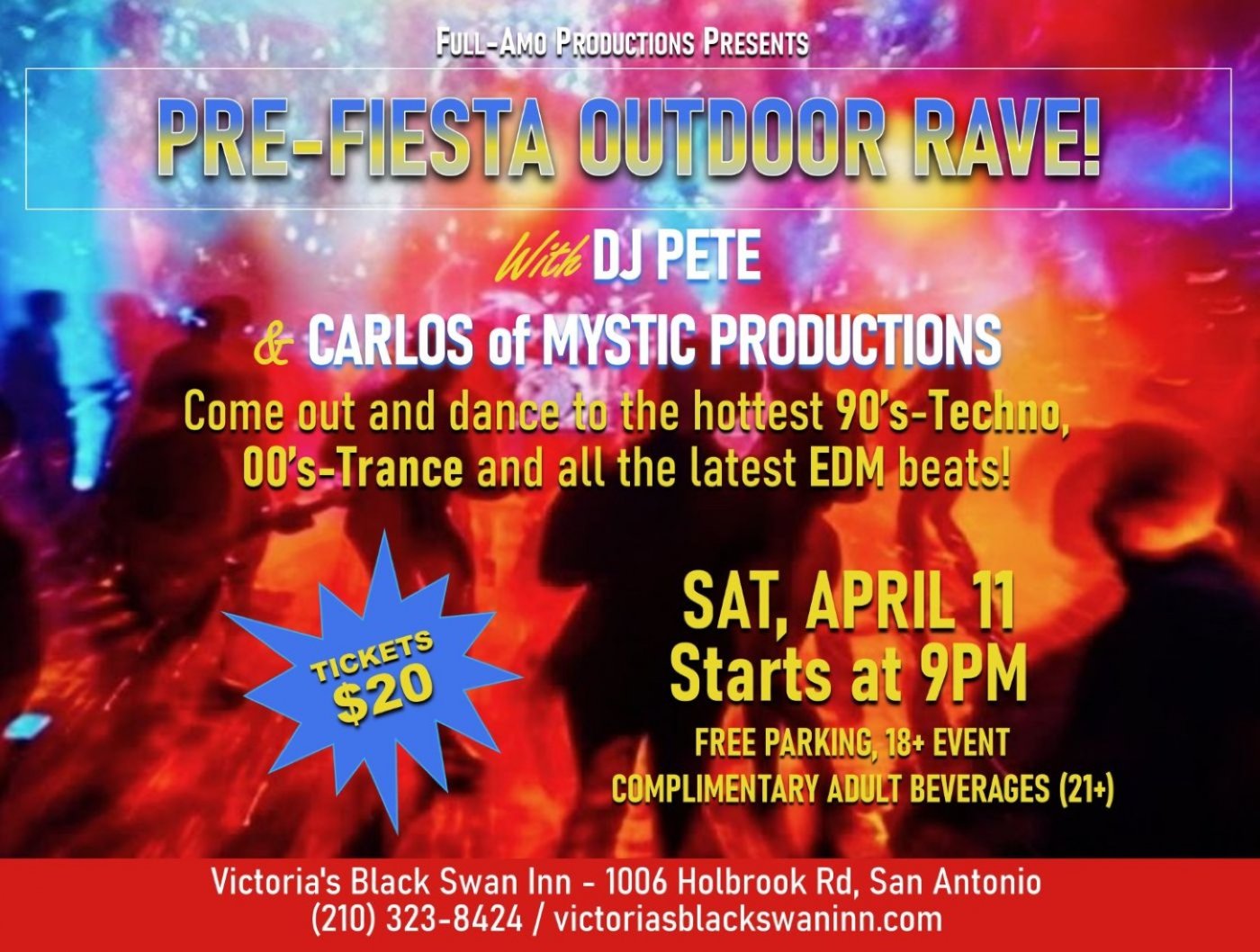 Get ready to ignite the night! Carlos of Mystic Productions and DJ Pete are bringing the heat with a Pre-Fiesta Outdoor Rave! that'll take you on a sonic journey through 90's Techno, 00's Trance, and the hottest & latest EDM tracks. Immerse yourself in a high-energy atmosphere, surrounded by good vibes and incredible music. Embrace the PLUR (peace, love, unity, respect) and join us for an electrifying night!