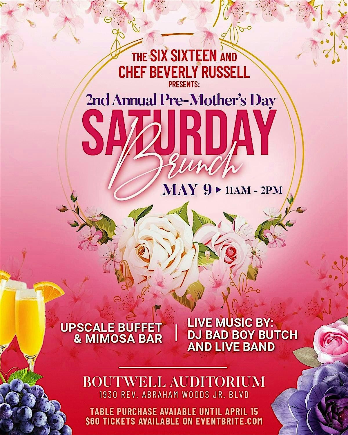 Welcome to the Pre-Mother's Day Brunch celebration! We are so elated to have you all back again for another year. This year we will have a live band, sounds by Dj Bad Boy Butch, a mimosa bar as well as a cash bar for cocktails, a curated buffet, and so much more!