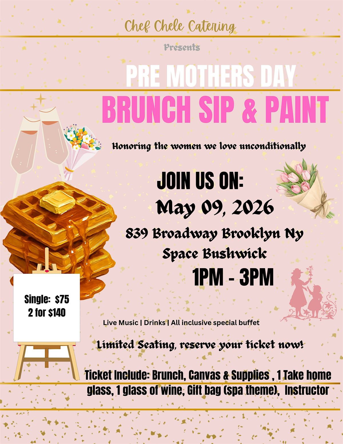 Let’s honor the women we love unconditionally by treating them to nice Sip & Paint Brunch! Come dress in your favorite soft floral color.