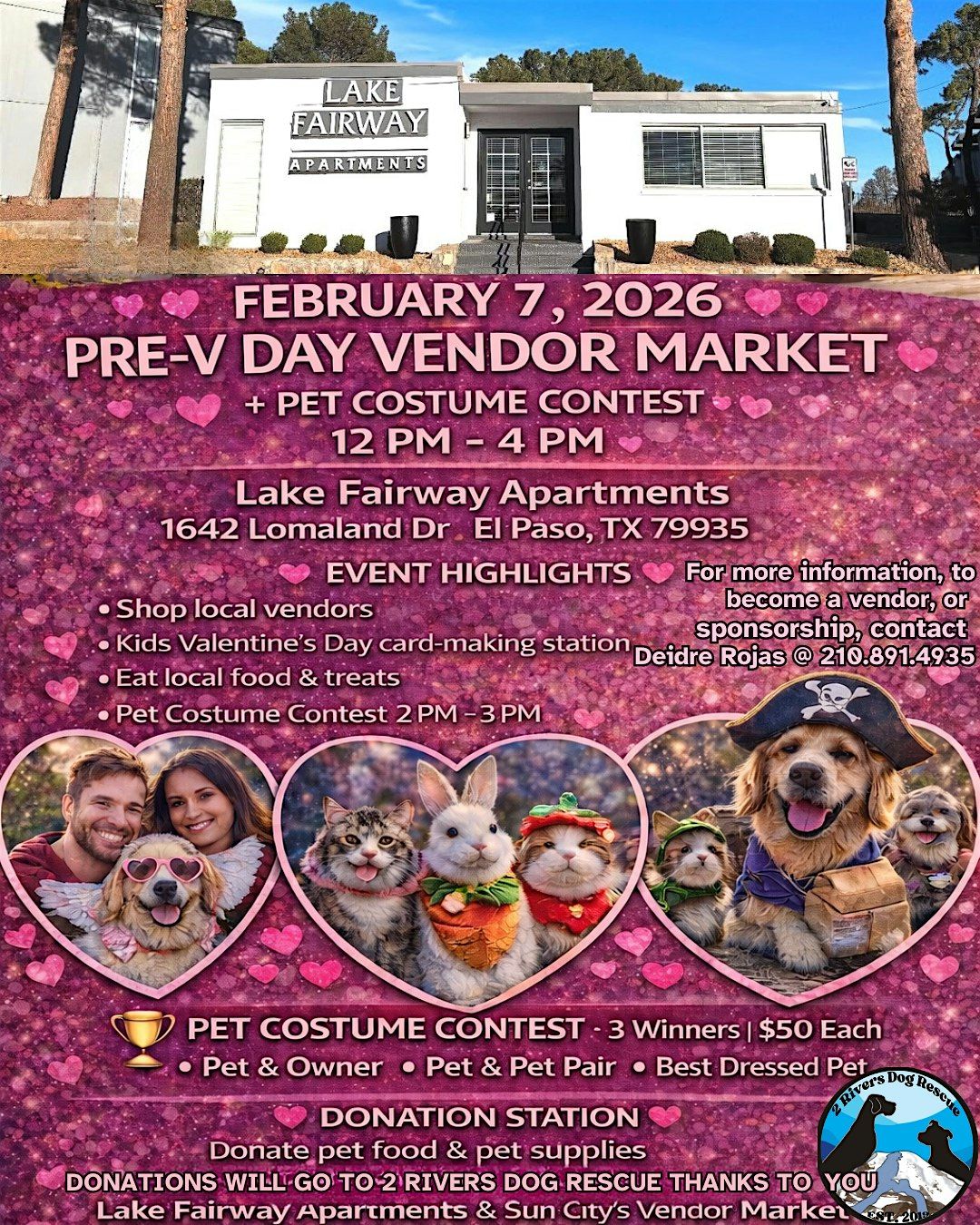 No pet? No problem! 🐾 Come explore amazing local vendors, savor delicious bites from Chi-Town 915 and Crepes & Craves, sip on drinks from Wildflower Coffee, and enjoy a fresh flower bar by Aloha Designs by Daniela plus plenty more vendors to shop & support! Kids can get crafty in the Valentine’s Card Making & Games Zone, all while grooving to live tunes at the beautiful Lake Fairway Apartments. Huge thanks to them for hosting and supporting this paw-some market! 🎶🛍️🍔