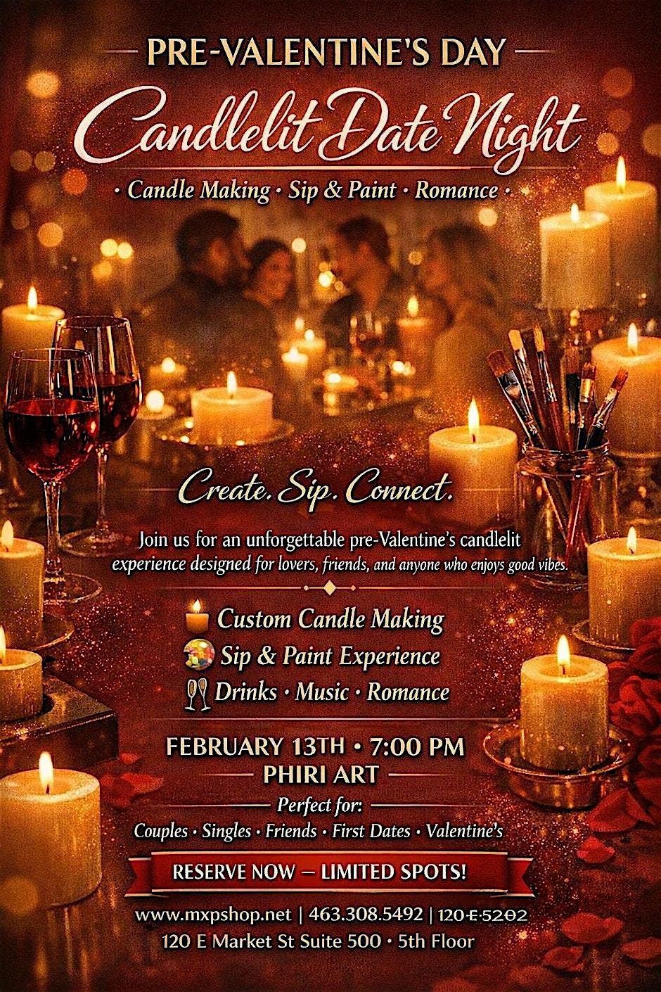 Get ready for an amazing evening filled with cozy vibes and creative fun! Join us in person for a candle making session paired with a chill sip and paint experience. Perfect for couples or friends looking to unwind, create something special, and enjoy great company. Light some candles, grab your favorite drink, and let's make memories before Valentine's Day!