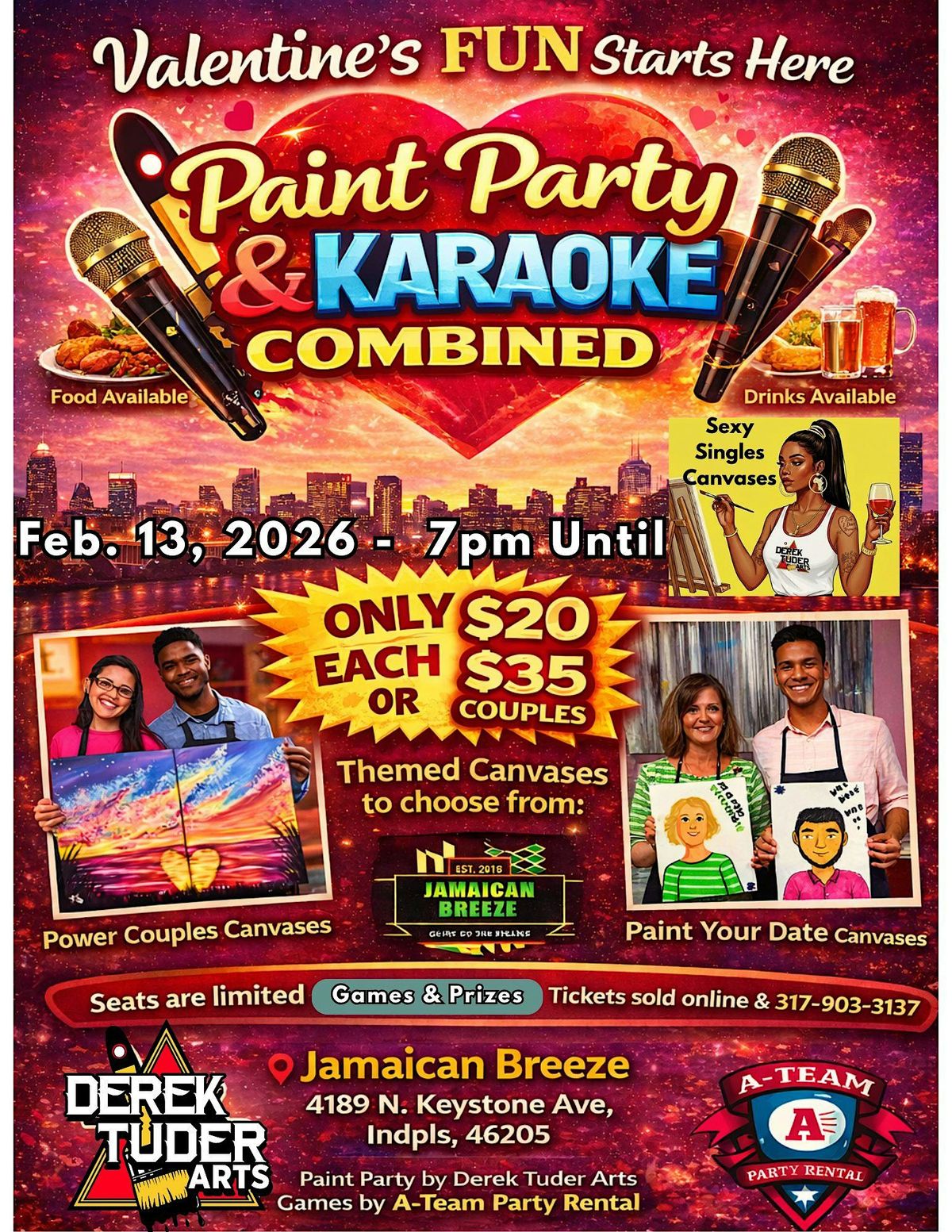 Whether you're rolling solo, boo’d up, or vibing with your crew, this night is built for bold strokes and big notes. With themed canvases like “Sexy Singles” and “Paint Your Date,” plus karaoke that’ll have you belting out your favorite love jams, it’s the ultimate mix of creativity and connection. Add games, prizes, and island-inspired eats at Jamaican Breeze, and you’ve got a whole mood. This isn’t just a party—it’s a pre-Valentine experience. Seats are flying—secure yours before it’s a wrap.