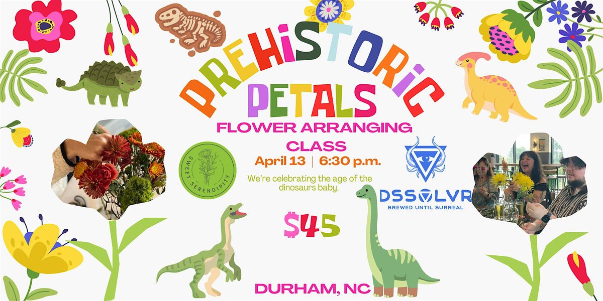 Grab a friend and learn the basics of floral design with local NC blooms at the DSSOLVR Durham Taproom! This class will have unique "dinosaur" flowers, unique greenery, and fun add-ons, mini dinosaurs included! Guided instruction will teach you all the tips and tricks you need to make a beautiful arrangement to bring home with you.