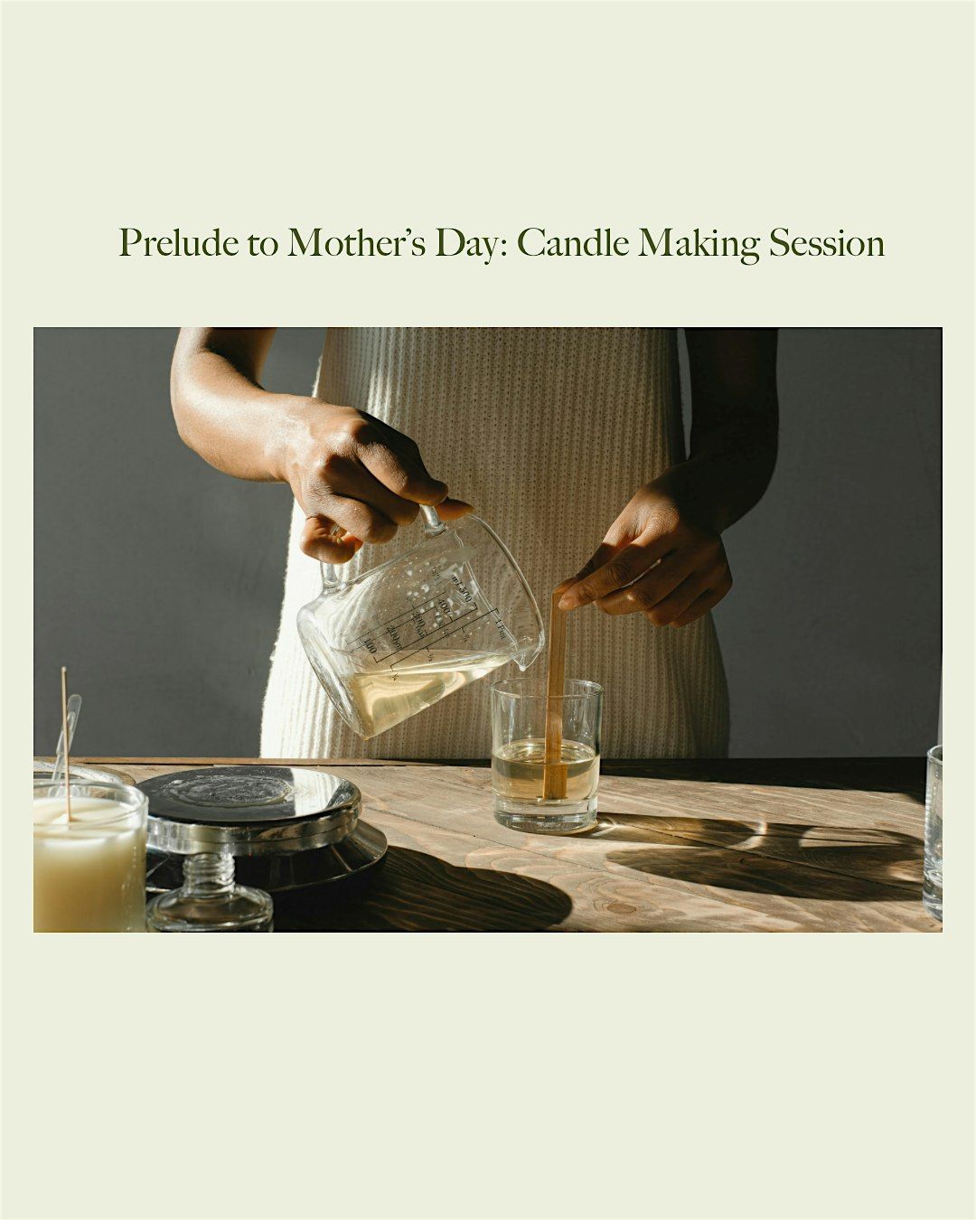 Get ready to celebrate Mom or yourself with a fun and hands-on candle making session! Join us in person to create a beautifully luxurious candle to gift or keep. Whether you're a pro or a total newbie, this chill event is all about creativity and good vibes. Bring your friends or come solo — either way, you'll leave with a special gift and great memories. Don't miss out on the perfect warm-up to Mothers Day!