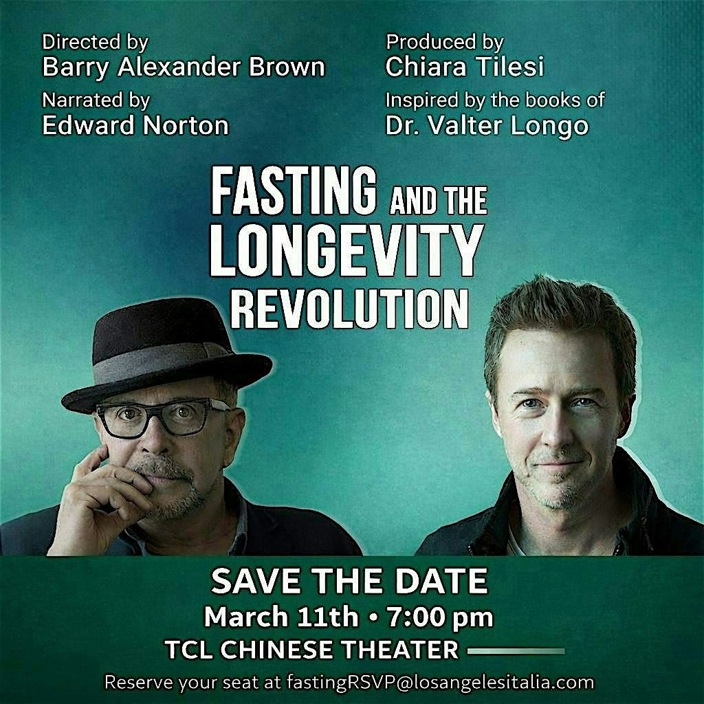 Join us on March 11 for the premiere screening of Fasting and the Longevity Revolution, featuring a live Q&A with Dr. Valter Longo, Edward Norton, Barry Alexander Brown, and Chiara Tilesi. Hosted by the LA Italia Film Festival, the evening will begin with the presentation of Excellence Awards honoring these four leaders before the discussion.