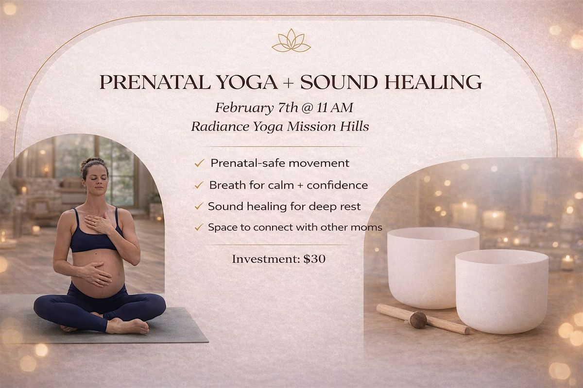 Join us in the heart of Mission Hills at Radiance Yoga for a gentle prenatal yoga and sound healing experience designed to support your body, calm your nervous system, and create space for deep connection during pregnancy.