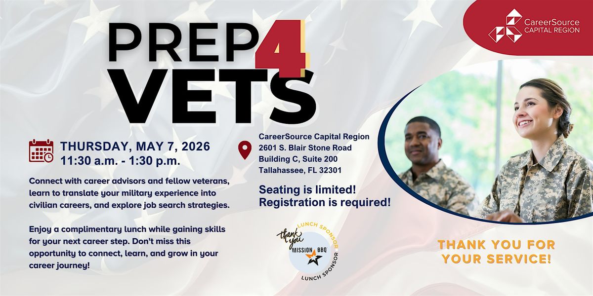 Veterans and Eligible Veteran Dependents who are looking for work are invited to connect with career advisors and fellow veterans, learn to translate your military experience into civilian careers, and explore job search strategies at the Prep4Vets.