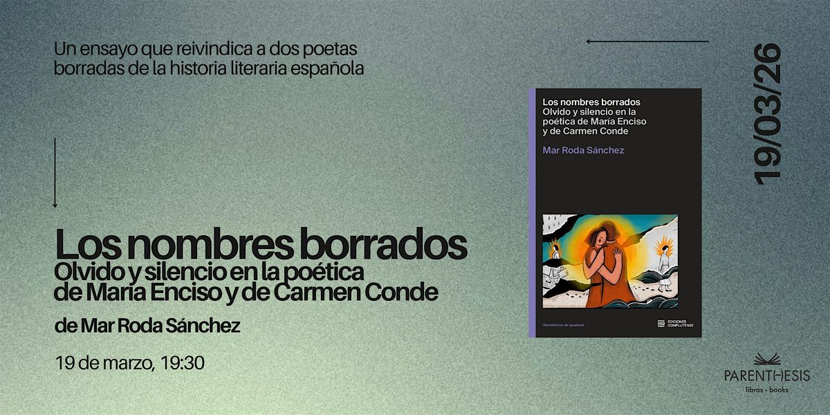 Os invitamos a la presentación de Los nombres borrados. Olvido y silencio en la poética de María Enciso y de Carmen Conde (Ediciones Complutense, 2025), el ensayo de Mar Roda Sánchez cuyo propósito es recuperar y poner en valor la obra de dos poetas silenciadas por la historia: María Enciso, exiliada, y Carmen Conde, condenada al "insilio" de la posguerra.