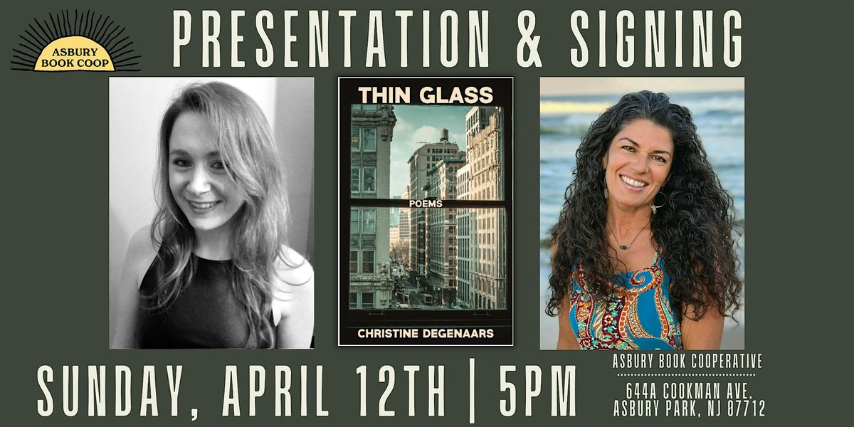 We are very excited to welcome Christine Degenaars to Asbury Book Cooperative! She will be presenting her newest title THIN GLASS in conversation with local author, Meredith Avakian!