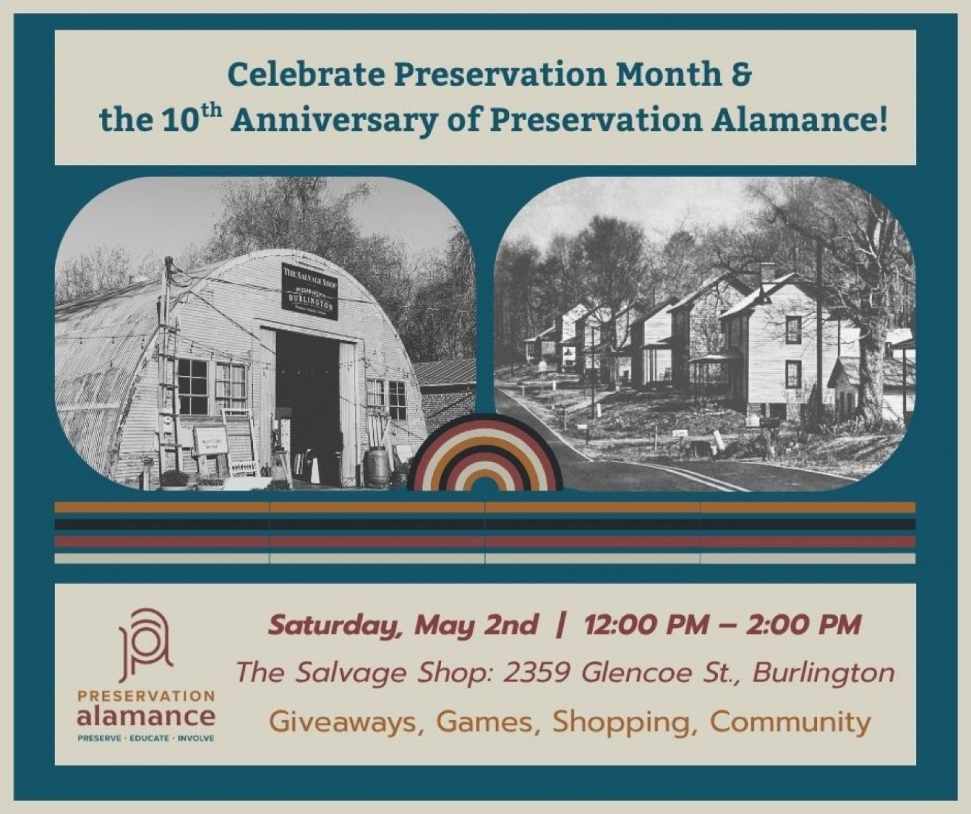 Join Preservation Alamance as we kick off our 10th Anniversary Year with a Spring celebration at the Salvage Shop. Whether you’re a vintage lover, a historic preservation enthusiast, or just looking for a fun Saturday afternoon, we’d love to see you there.