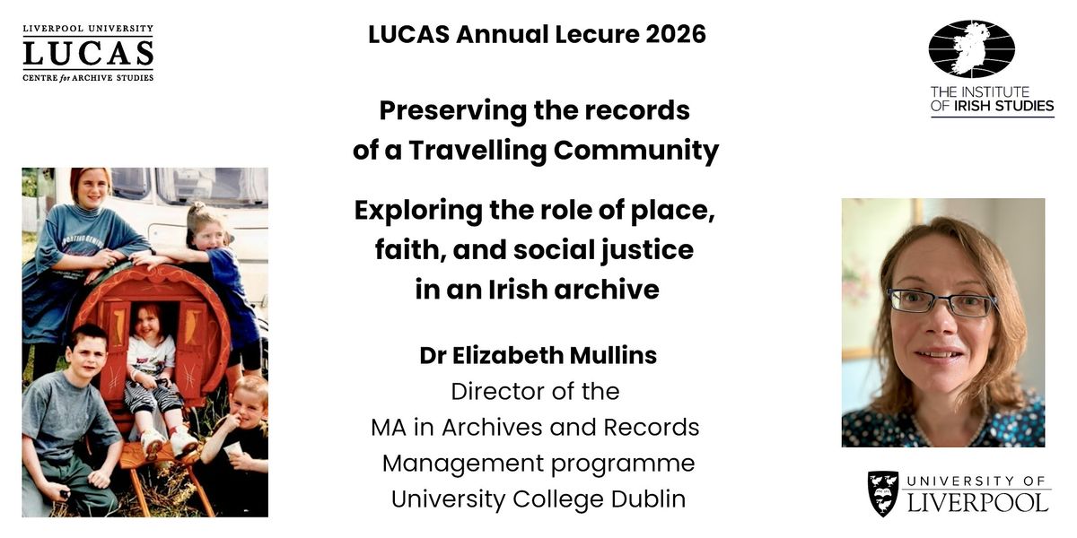 Liverpool University Centre for Archive Studies(LUCAS), in association with The Institute of Irish Studies, University of Liverpool, is delighted to welcome Dr Elizabeth Mullins (Director of the MA in Archives and Records Management programme, University College Dublin) for the LUCAS Annual Lecture. Dr Mullins' talk will focus on an ongoing project to preserve the archive of a Roman Catholic parish that is dedicated to members of the Irish Travelling Community.
