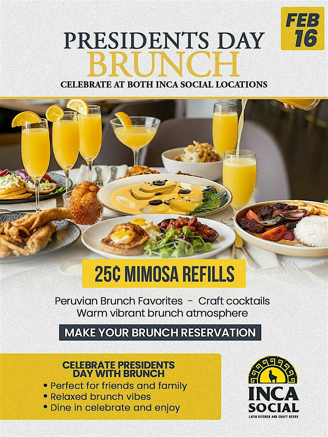 Join us for Presidents Day Brunch featuring our famous 25 cent mimosa refills, available during brunch, paired with our full Inca Breakfast menu and guest favorite brunch dishes. Enjoy classics like pollo and waffles, pan con chicharrón, and other Peruvian inspired brunch plates made to start your day right.