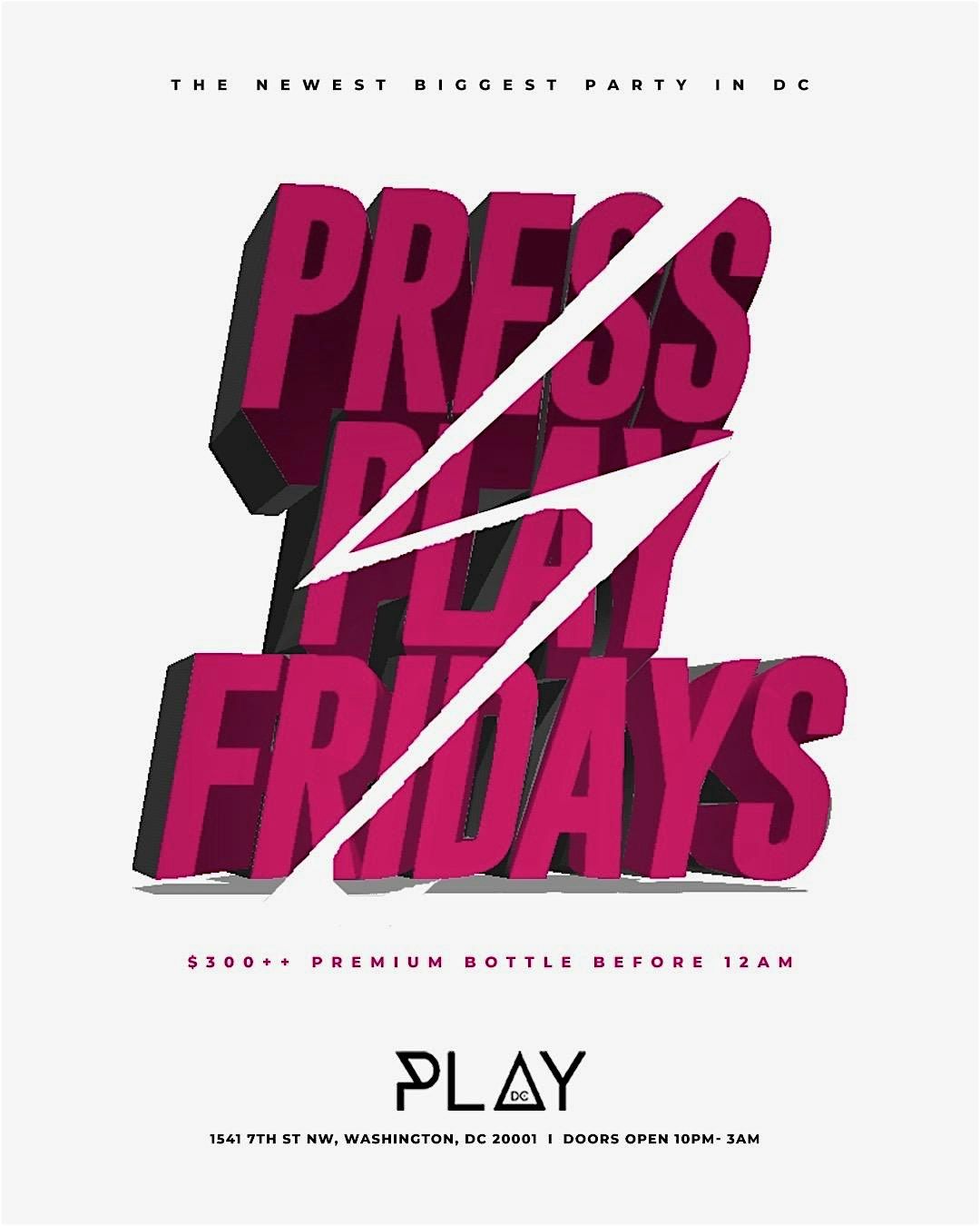 Welcome to Press Play Fridays at Play DC Lounge! Get ready to kick off your weekend with the hottest beats and coolest vibes in town. Join us for a night of non-stop fun and excitement.