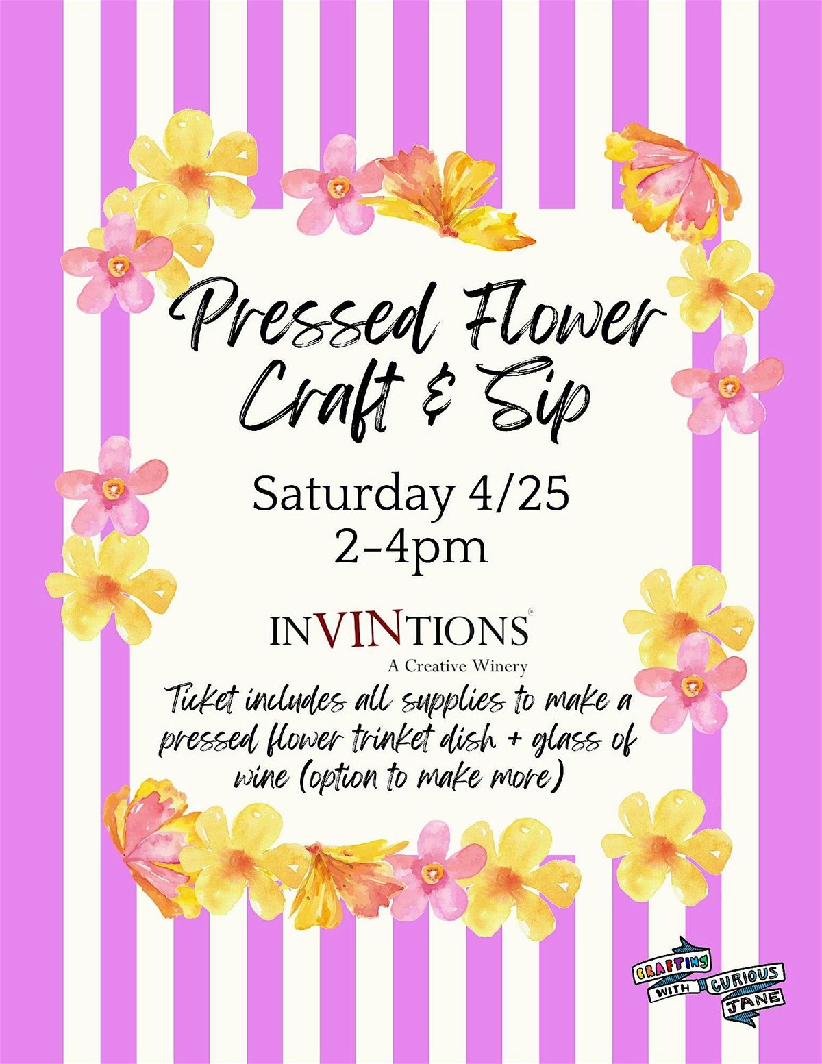 Join Curious Jane Crafts at InVINtions Creative Winery for a relaxed afternoon of crafting and wine. Each ticket includes a 3" white trinket dish that you’ll decorate with pressed flowers and gold trim, along with a complimentary glass of wine.