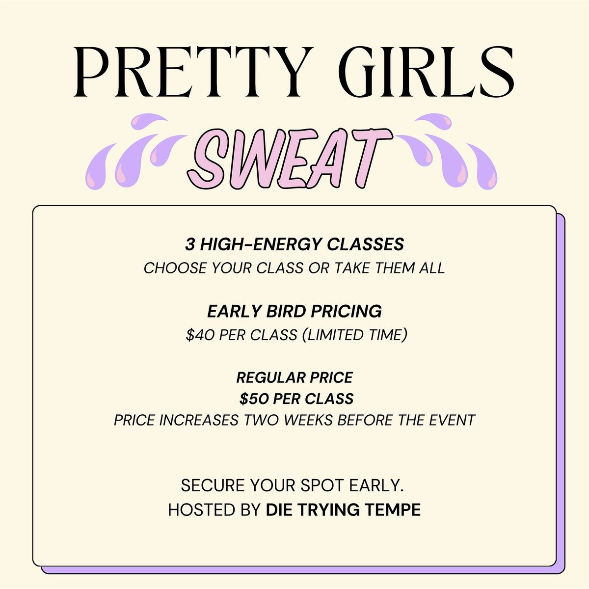 Pretty Girls Sweat is designed to create an empowering environment where women can come together to move, sweat, and connect. Expect a fun, high-energy workout experience led by multiple instructors with great music, great people, and an atmosphere built around confidence and community.