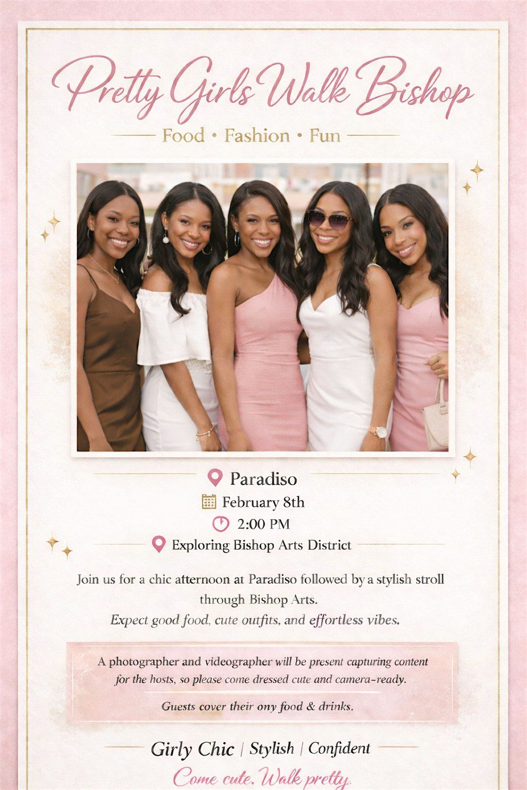 We’re starting with lunch at Paradiso, then taking a stylish stroll through Bishop Arts to explore, shop, laugh, and capture cute moments together. Think girly energy, effortless confidence, and making memories with like-minded women.