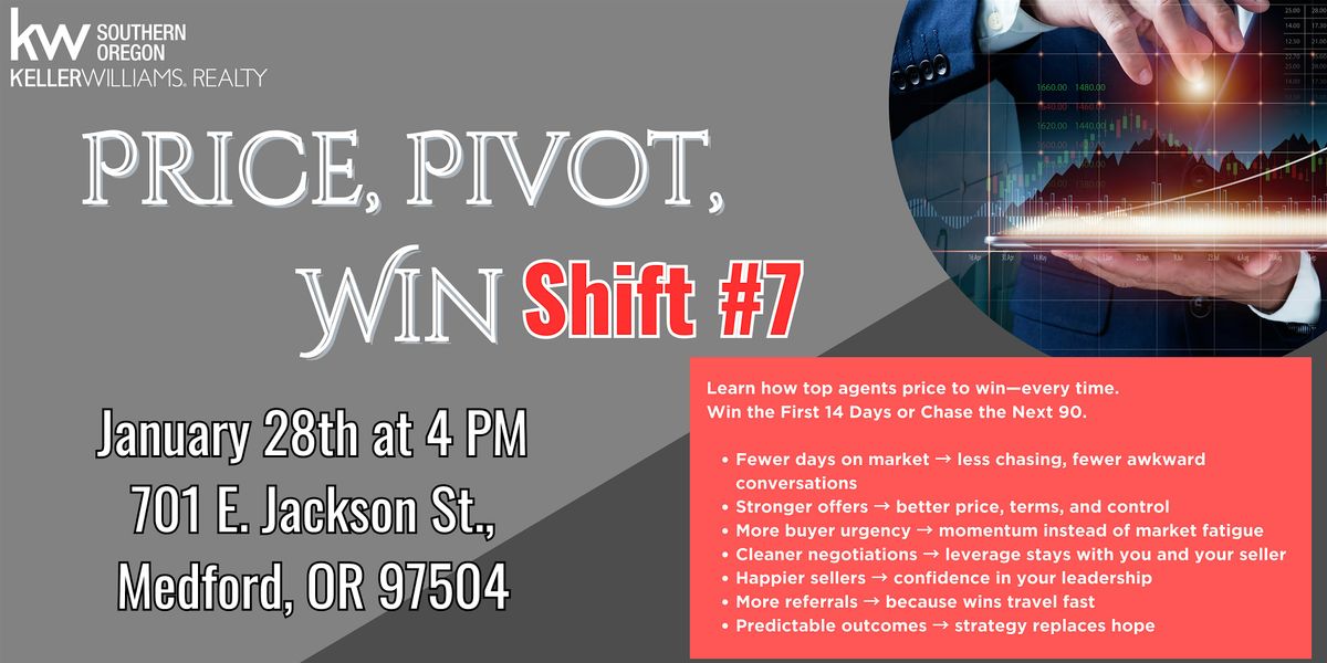 This class, hosted by Keller Williams Southern Oregon, is a professional development session for real estate agents titled "PRICE, PIVOT, WIN: Shift #7." It focuses on strategic pricing techniques to ensure listings sell quickly and effectively in a shifting market.