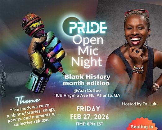 February is Black History Month, and this Pride Open Mic is a space to honor the loads we carry—the stories, histories, joys, grief, resilience, and truth held in Black queer bodies and lives.