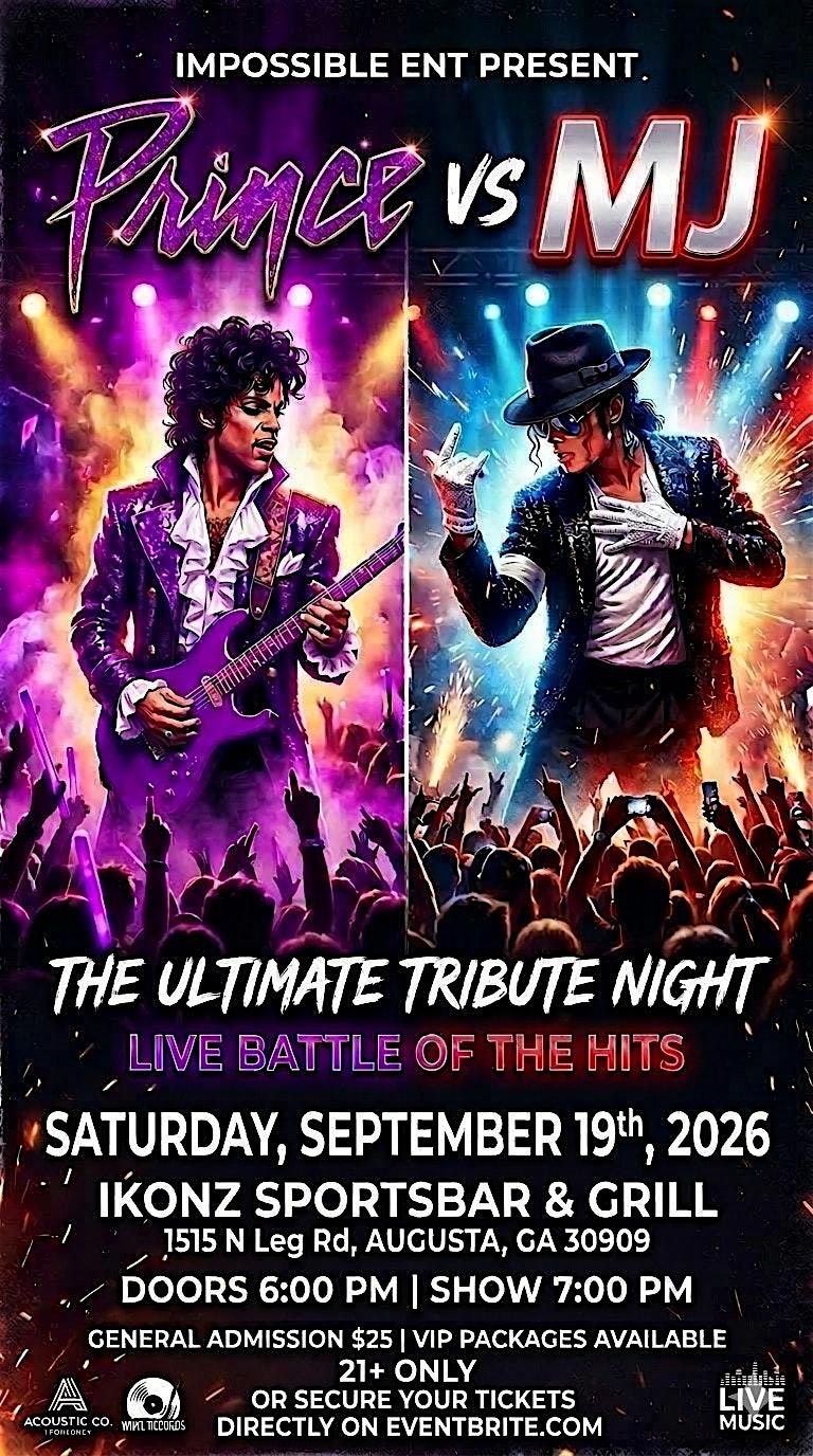Get ready for an unforgettable in-person night celebrating the legends themselves! Experience the magic of Prince and Michael Jackson as their iconic hits come alive on stage. Sing, dance, and vibe with fans who love the King of Pop and the Purple One just as much as you do. This tribute night is packed with energy, nostalgia, and epic performances you won't want to miss!