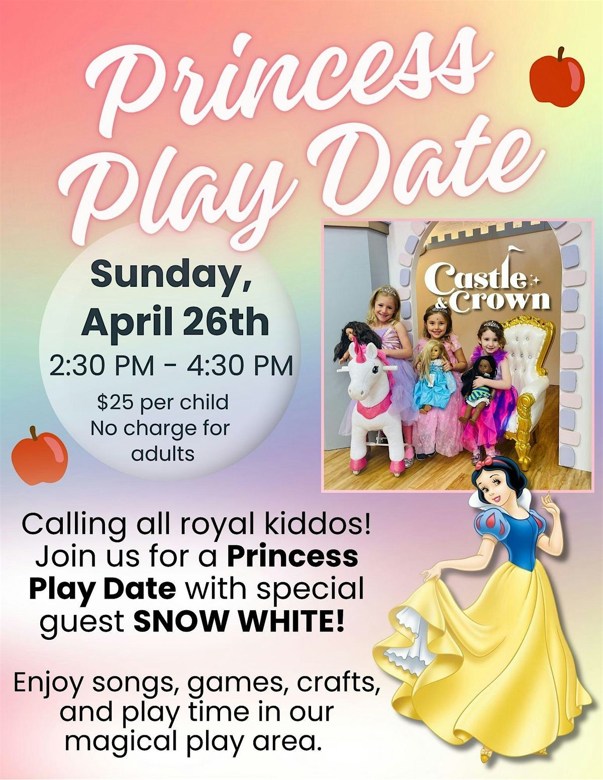 Calling all royal kiddos! Join us for a Princess Play Date with special guest SNOW WHITE! Enjoy songs, games, crafts, and play time.