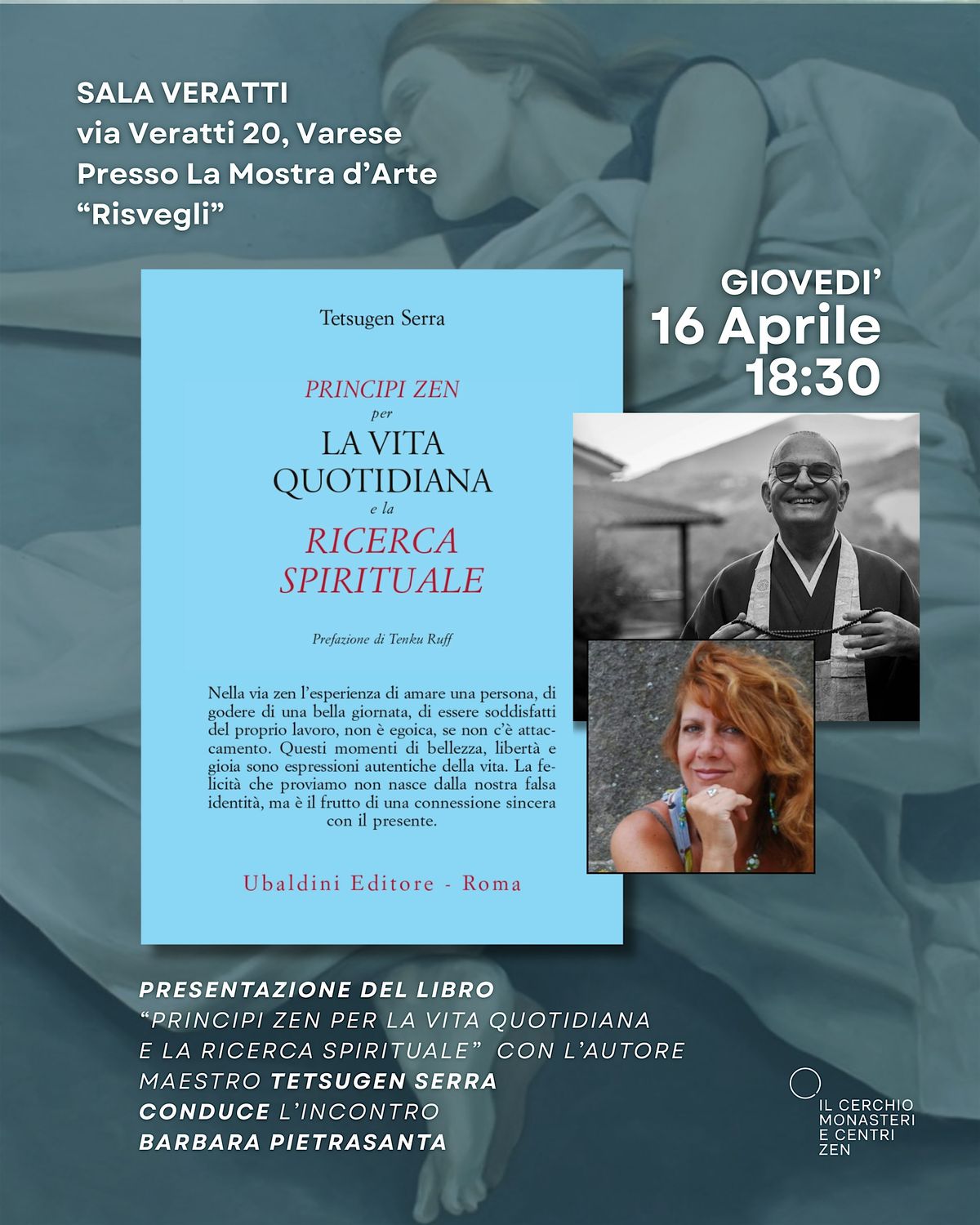 La serata prevede gli interventi del Rev. Tetsugen Serra e di Barbara Pietrasanta, autrice della mostra "Risvegli" che sarà esposta proprio in quei giorni e che farà da cornice al dialogo su prospettive diverse sulla Via Zen e sulla sua integrazione nella vita quotidiana.
