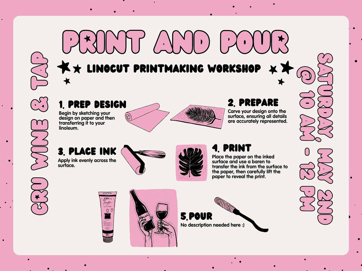 Ready to use your imagination and get your creativity flowing? Join us in person for Print and Pour – a fun, laid-back linocut printmaking workshop where you'll learn cool carving and printing techniques. Whether you're a newbie or a print pro, come make unique prints while enjoying good vibes and great company at Cru Wine & Tap. Don’t miss out on this awesome chance to explore art in a chill setting!