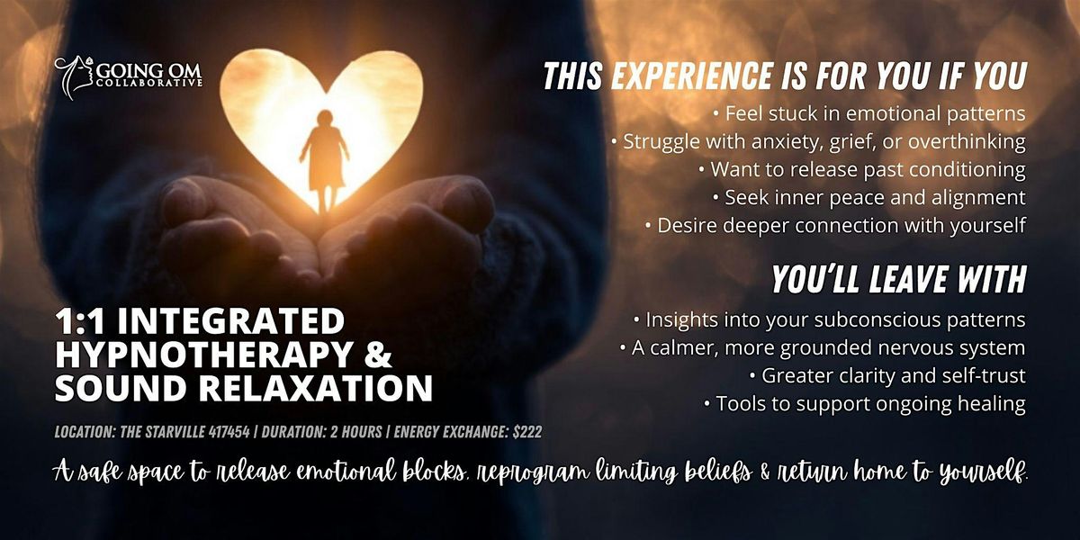 This session offers you a compassionate space to pause, breathe and reconnect with your inner self. Through integrated hypnotherapy, you’ll be gently guided into a relaxed, receptive state to explore and reframe subconscious beliefs that no longer serve you. As your awareness expands and your body relaxed, the journey continues into sound relaxation with soothing frequencies from singing bowls/ gong/ drum/ other sound tools that support emotional integration and nervous system regulation.