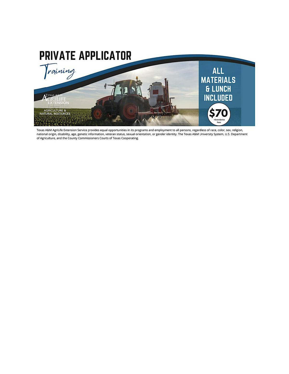 Join us at the Texas A&M AgriLife Extension Office in Galveston County on October 6, 2025, at 8:30 AM (Central Time) for the Private Applicator Pesticide License Training.