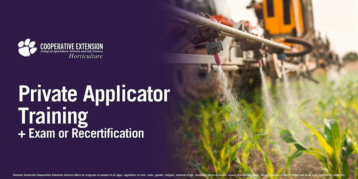 Join us on Tuesday, December 2, 2025, in the DHEC Training Room at the Greenville County Clemson Extension office for a Private Applicator Training, Private Pesticide Applicator exam, or recertification training.