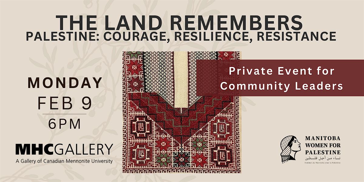 We would like to invite you to a private viewing of The Land Remembers. The Land Remembers is a multi-media, community-rooted art exhibition that honours Palestinian memory and heritage. Hosted by the MHC Gallery, the exhibition aims to share local, national and international Palestinian voices with Manitobans.
