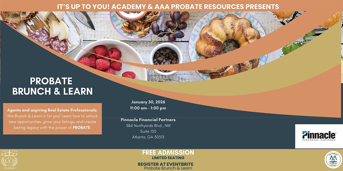 Attention Agents and aspiring Real Estate Professionals: It’s Up To You! Academy and AAA Probate Resources invite you to an exclusive Probate Brunch & Learn—a dynamic session designed to elevate your real estate strategy through the often-overlooked niche of probate.