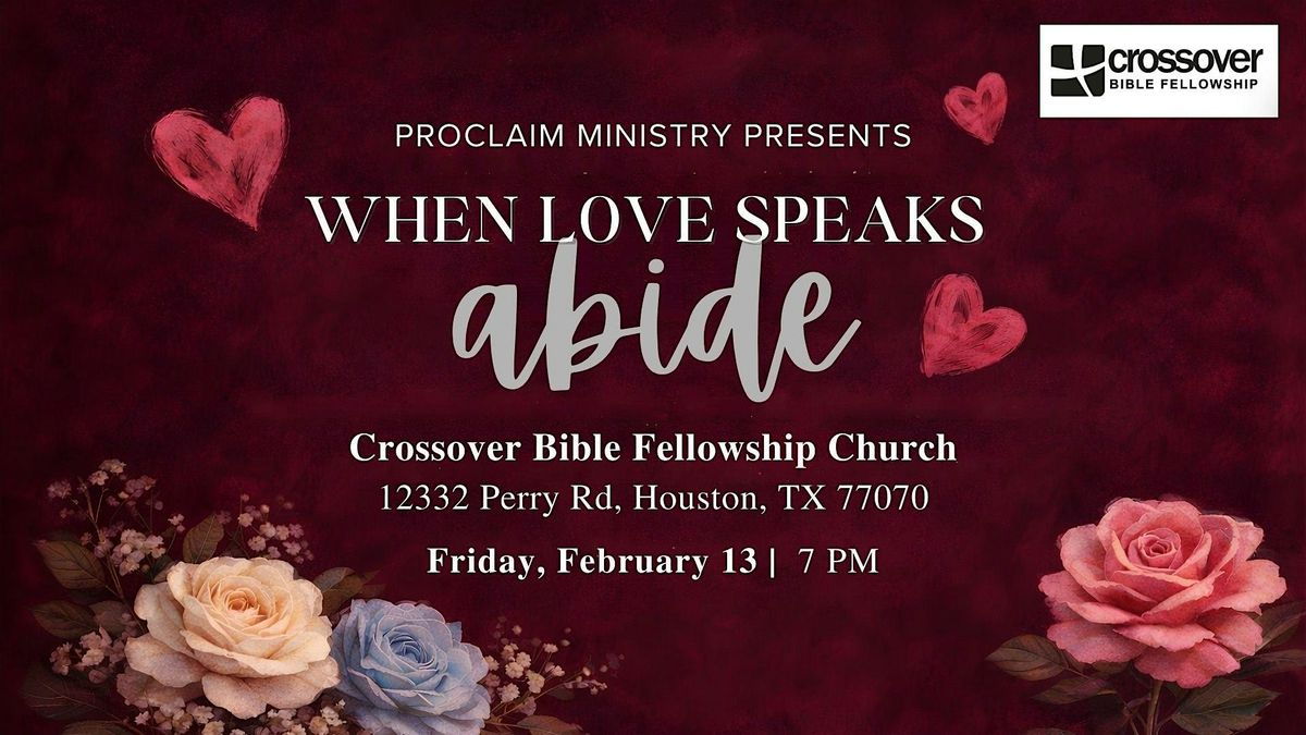 Welcome to Proclaim Ministry Presents: When Love Speaks: Abide! Join us at 12332 Perry Rd on February 13, 2026 at 7:00 PM (Central Time) for a night of inspiration and reflection. Let's come together to explore the power of love and the importance of abiding in it. This event is a wonderful opportunity to connect with others and deepen our understanding of love. Don't miss out on this special evening filled with meaningful conversations and heartfelt moments. See you there!