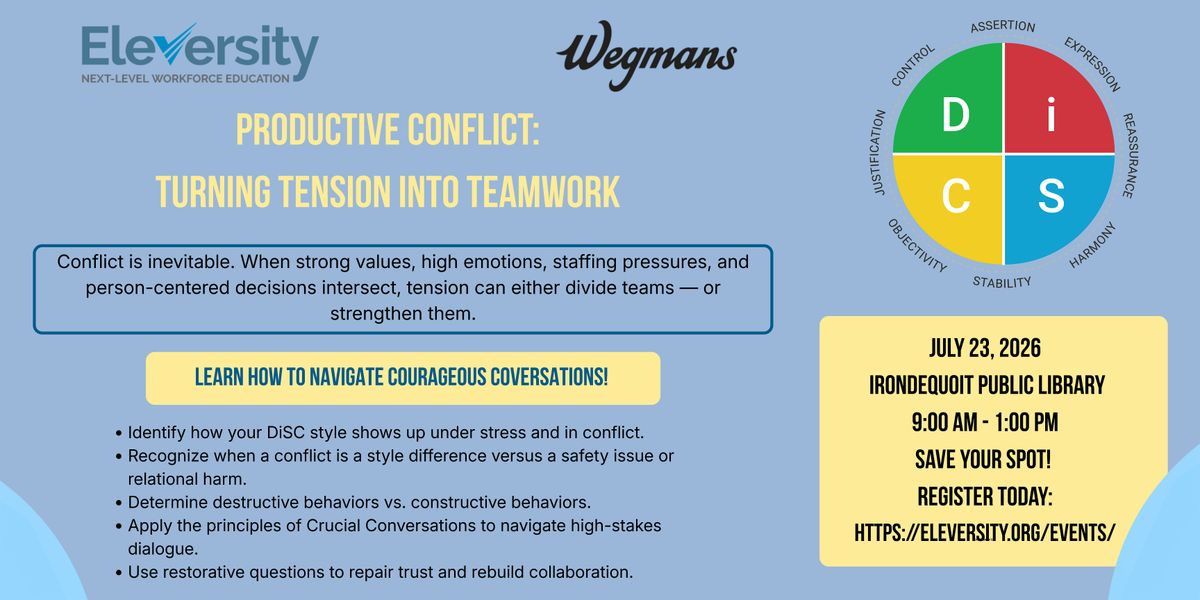 Participants will explore how their DiSC® Workplace style influences how they approach conflict. Using style awareness as a foundation, leaders will learn how to recognize behavioral triggers, reduce misinterpretations, and adapt their communication to work more effectively across differences.