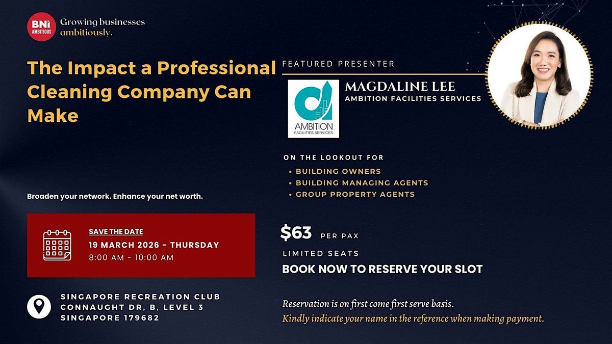 Step into the dynamic world of BNI Ambitious Singapore, member-focused business referral network where connections flourish! Forge enduring relationships with fellow business professionals who share your vision, while unlocking endless possibilities through referral marketing.