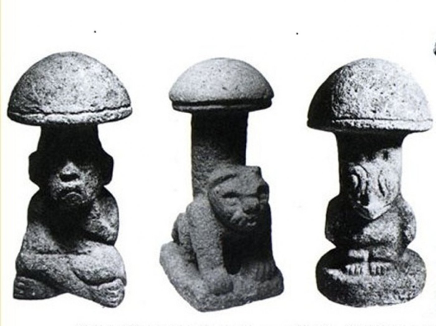 Image: Stone statues from 1000 BC to 500 AD depicting creatures with mushroom caps on their heads (National Institute on Drug Abuse / Wikimedia Commons).