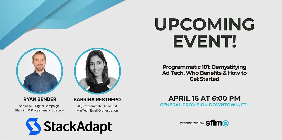 In this session, Sabrina Restrepo and Ryan Bender of StackAdapt will break down programmatic advertising in clear, practical terms, explaining how todayβs digital ad ecosystem actually functions, who it benefits most, and how buying and placement have evolved since the early 2000s. This foundational discussion is designed to help brands and agencies better understand, without the technical overwhelm, where programmatic fits into broader marketing strategies, from omnichannel planning to MarTech orchestration.Thursday, April 16th, from 6:00 pm to 8:00 pm at .
