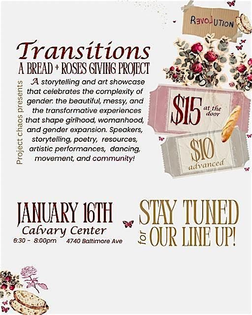 Join us for an awesome in-person event that’s all about gender justice. Transitions is a fundraiser for the Bread and Roses Gender Justice Giving Project. Join us for a storytelling and art showcase that celebrates the complexity of gender: the beautiful, messy, and the transformative experiences that shape girlhood, womanhood, and gender expansion.