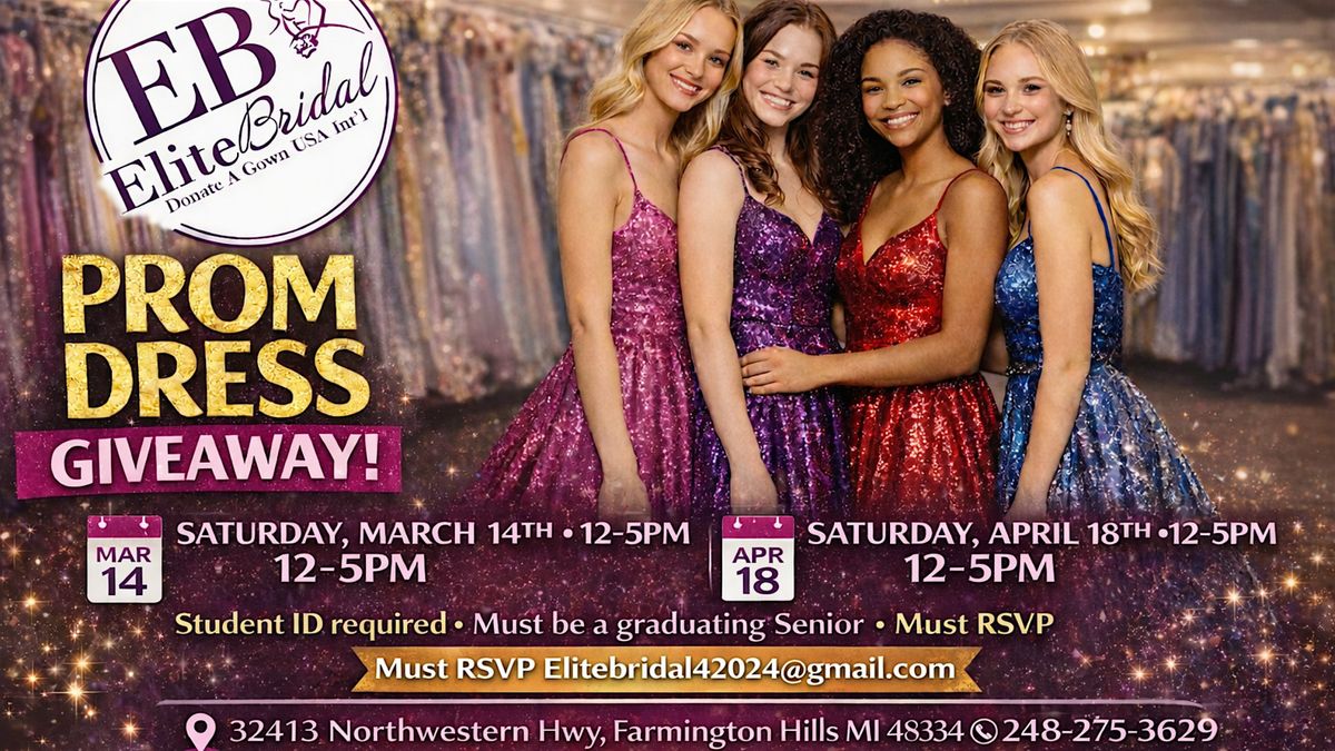 Come join us for a fabulous Prom Dress Giveaway event! We'll be giving away beautiful dresses for your special night. Don't miss out on this opportunity to find the perfect dress for your prom. The event will take place at 32413 Northwestern Hwy on every Saturday beginning on March 14, 2026 at 12-5:00PM -AND- Saturday April 18, 2026 at 12-5:00PM. Please register here, so we are able to accommodate you. Get ready to shine on your big night!