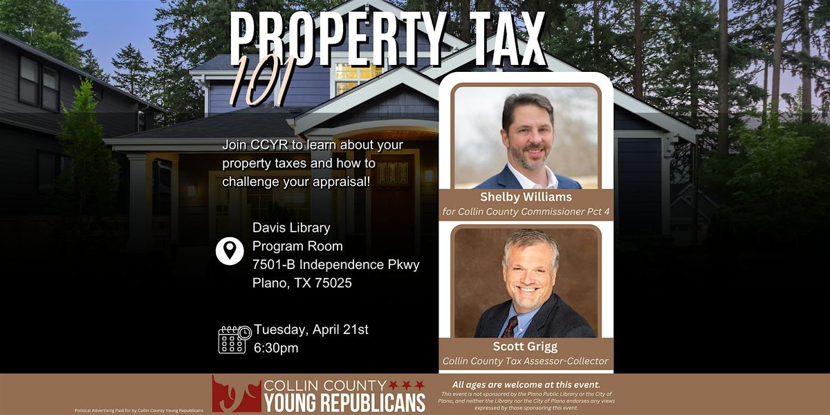 7501-B Independence Pkwy, Plano, TX 75025Featuring expert insights from Shelby Williams candidate for Collin County Commissioner Pct 4 and Scott Grigg our Collin County Tax Assessor Collector.Don’t miss this opportunity to get informed, ask questions, and take control of your property taxes. All are welcome!
