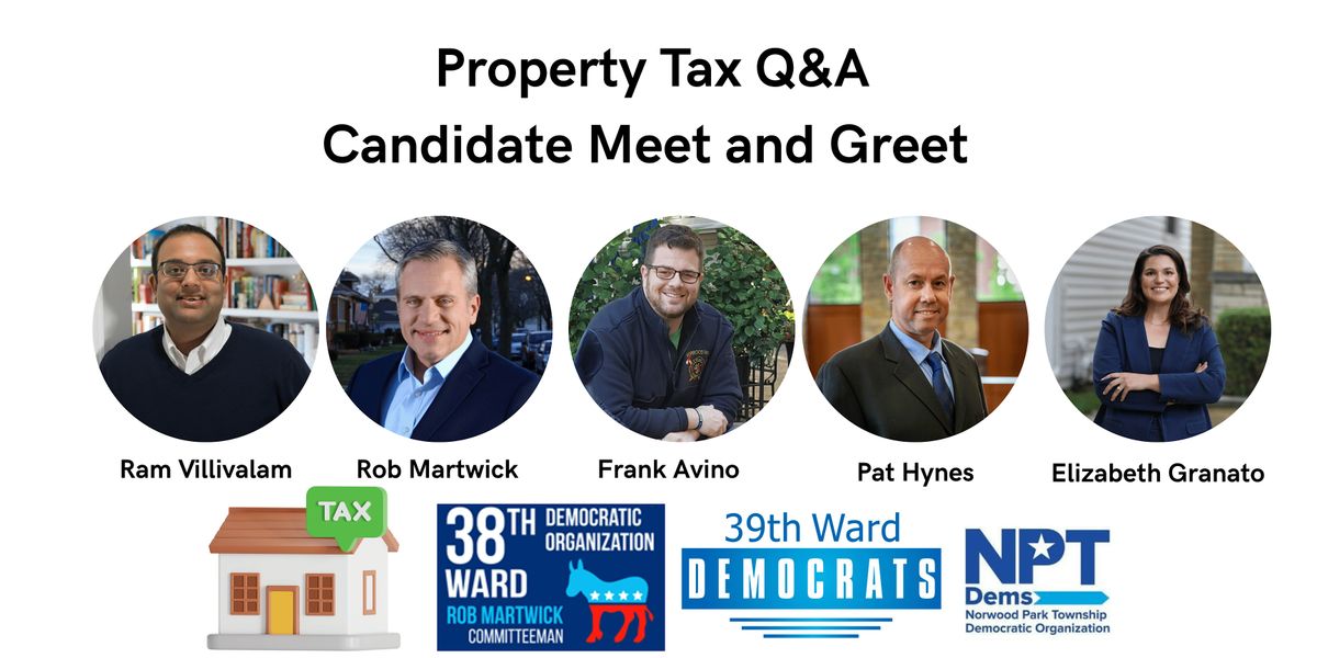 Join us in person for a questions and answers about property taxes and get to know the candidates Pat Hynes running for Cook County Assessor and Elizabeth Granato running for Cook County Commisioner - 12th District hosted by the 38th, 39th, and NPT Democratic Committees. Bring your questions, share your thoughts, and connect with neighbors and candidates in a relaxed setting. Don’t miss this chance to learn and engage with the community!