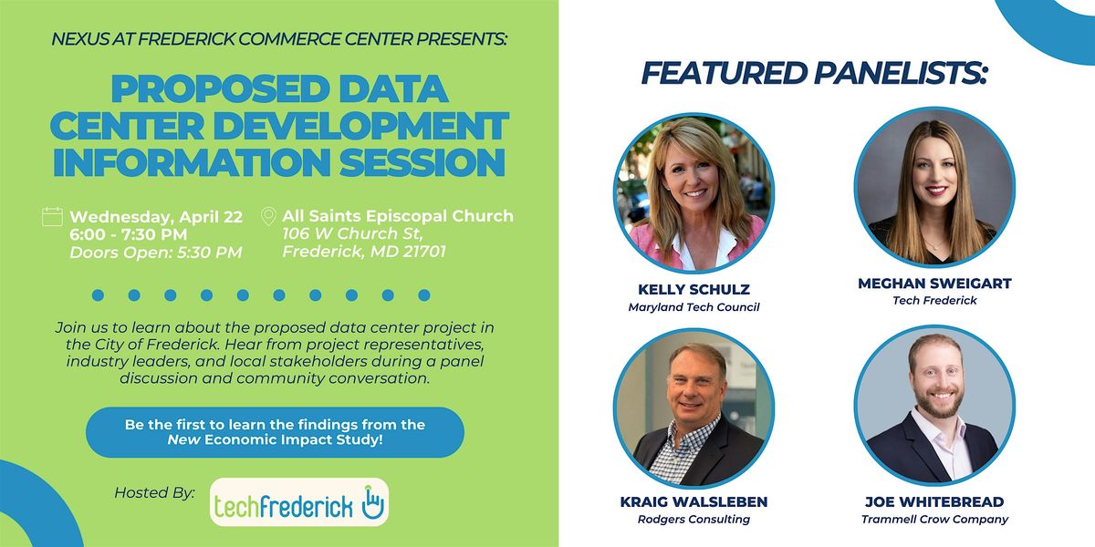 The session will feature perspectives from Kelly Schulz (Maryland Tech Council), who will share a statewide technology priority perspective; Meghan Sweigart (Tech Frederick), who will provide a Frederick-focused technology perspective; Kraig Walsleben (Rodgers Consulting), who will offer a data center technical perspective; and Joe Whitebread (Trammell Crow Company), who will present a project-specific overview.
