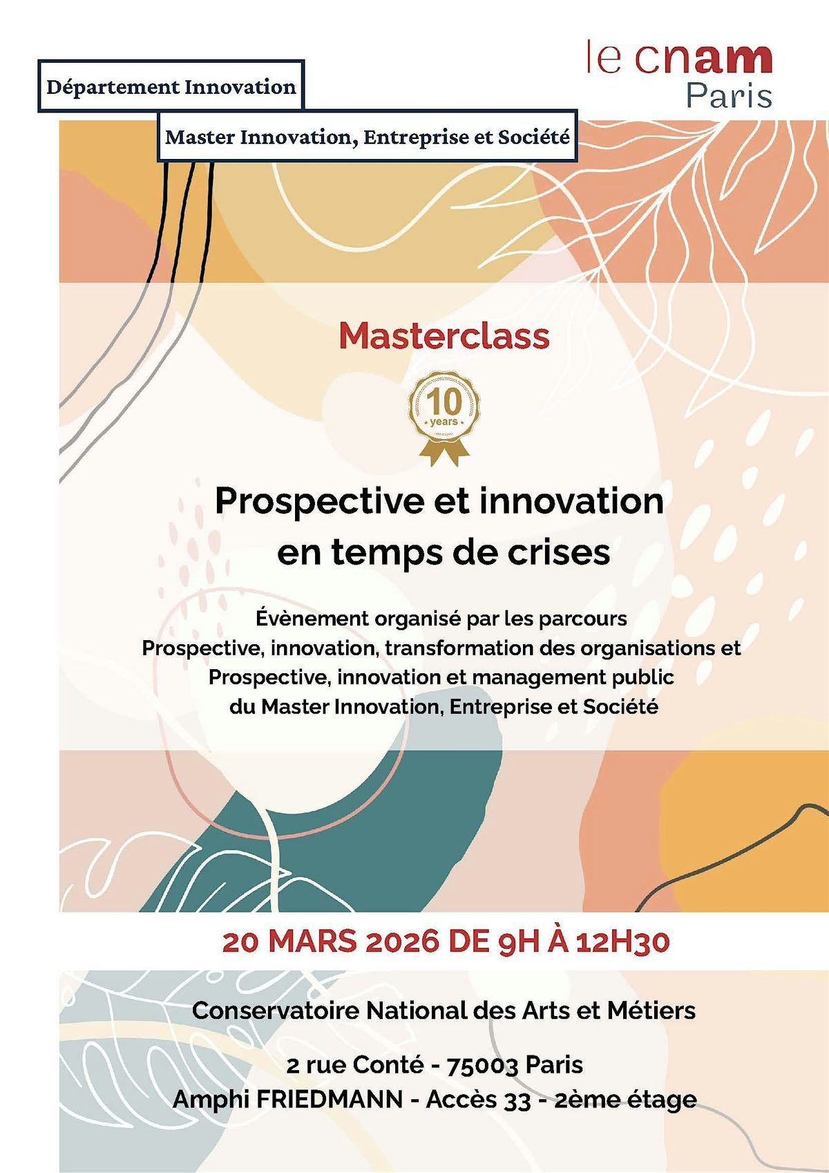 Nous avons le plaisir de vous inviter à la Master Class du Master 2 et ses deux parcours P1— Prospective, innovation, transformation des organisations privées P2 — Prospective, innovation, management public, notre rendez-vous annuel qui réunit auditeurs du Master, enseignants-chercheurs et professionnels autour de 5 intervenants qui viendront partager avec vous leurs recherches, leurs expériences, leurs réflexions suivis de temps de discussion-débat.