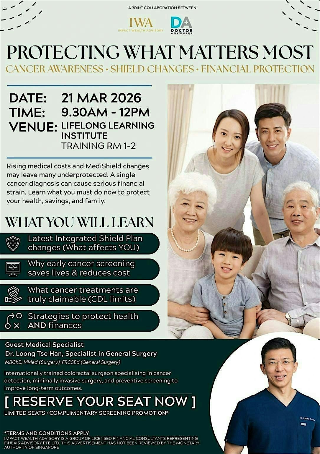 This session will feature Dr. Loong Tse Han, Specialist in General Surgery, an internationally trained colorectal surgeon with extensive experience in cancer detection, preventive screening, and minimally invasive treatment.Seats are limited. Complimentary screening promotion available for attendees (terms apply).