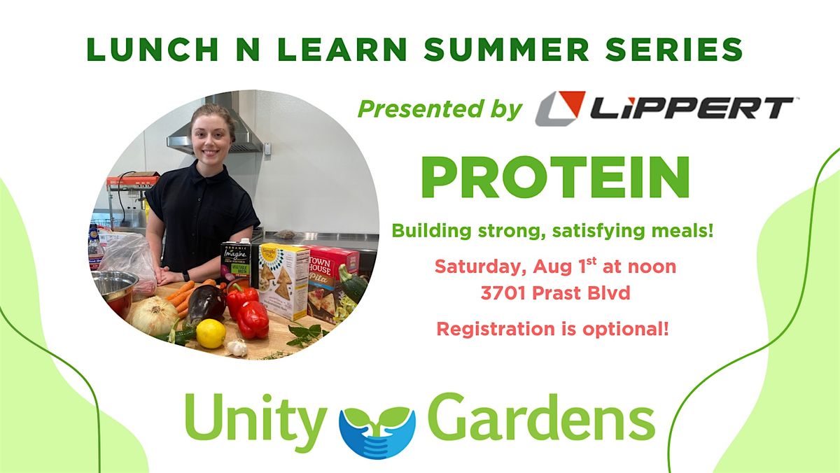 Join us for our free Lunch n Learn Series at Unity Gardens! Lunch 'n Learns are a time for us to get familiar with what's in season and how to enjoy it. Each session will focus on something in session and discuss kitchen preparation. All ages are welcome. Due to the nature of the class, we'll only hold sessions in person, but recipes, handouts, and presentations will be available following the class. For our first class, we'll be focusing on protein, both animal and plant based! This session is taught by Marin Easton, MPH, RDN, a clinical dietitian. This series is made possible through the generous support of Lippert Components!